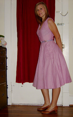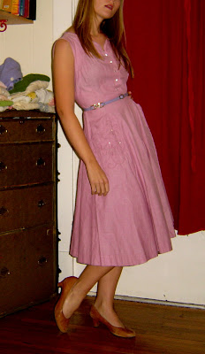 The dress is late 1940’s — no zipper — and features rhinestone buttons down the front, and darling pockets with an embroidered flora motif and rhinestone studs. It has the classic 40’s A-line silhouette and and is made of pink cotton material in which the weave is visible. It also came with a thin purple belt with brass clasps (shown above). Bonus!