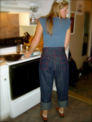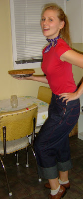 These are women’s jeans from the 1940’s. I found them in an antique mall in Missouri two weekends ago and I TOTALLY LOVE THEM! The have a sturdy brass colored zipper on the side and the stitching is orange. In these photos I have them rolled-up in the style consistent with how they would have been worn in the 40’s and 50’s. The saddle shoes might bring these up to the 50’s, but they are the closest I’ve got to period shoes to go with jeans.