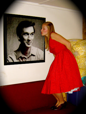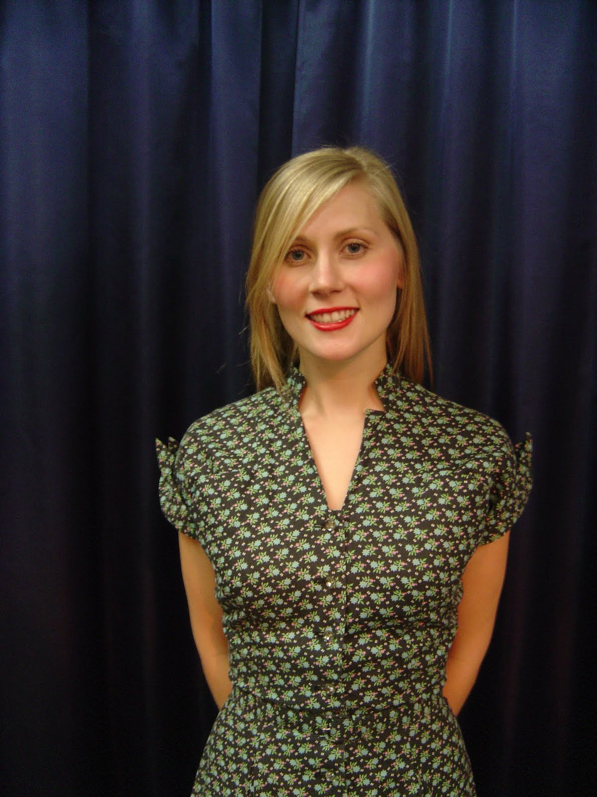 I wore a dress that I received in the mail…yes that’s right, I am now acquiring vintage via USPS. After playing in Tulsa last year, the hostess of this house concert series, Andrea, sent me a package containing a Hawaiian Print Skirt, 50’s beaded sweater, earrings, a necklace, and this gorgeous 50’s cocktail dress…all of which fit perfectly! I love the deep V neckline, sexy red floral print, and bell-shaped skirt.