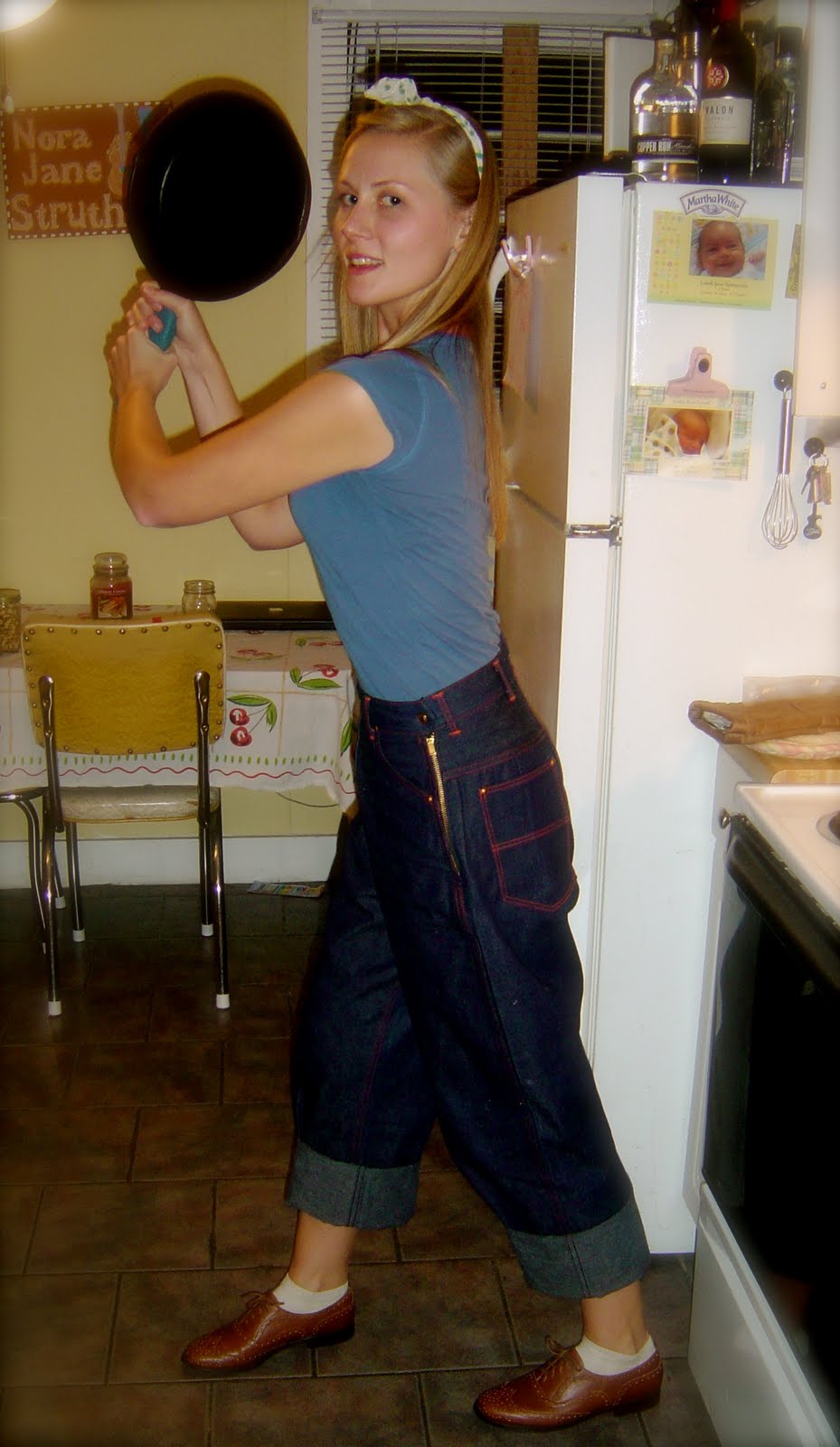 These are women’s jeans from the 1940’s. I found them in an antique mall in Missouri two weekends ago and I TOTALLY LOVE THEM! The have a sturdy brass colored zipper on the side and the stitching is orange. In these photos I have them rolled-up in the style consistent with how they would have been worn in the 40’s and 50’s. The saddle shoes might bring these up to the 50’s, but they are the closest I’ve got to period shoes to go with jeans.